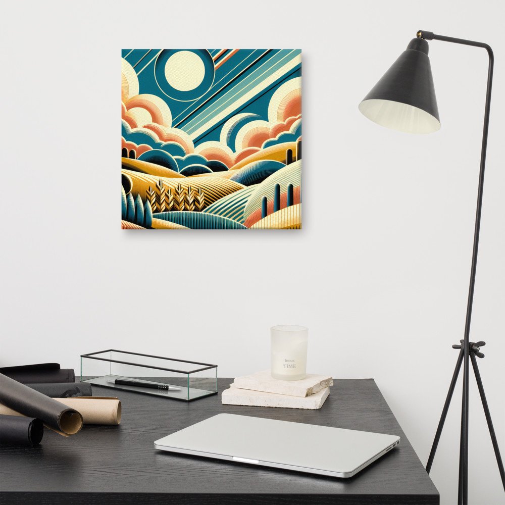 Retro Geometric Sun and Clouds Over Rolling Hills — Canvas Print