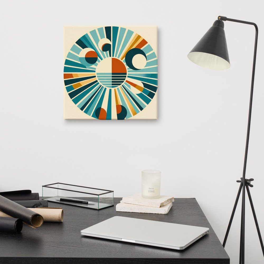Mounted on a deep stretcher frame, this artwork brings the geometric sunburst into the room with tangible depth. The precise rays and circles in a vintage palette stand out against the cream background, creating a focal point with a distinct mid-century modern character.