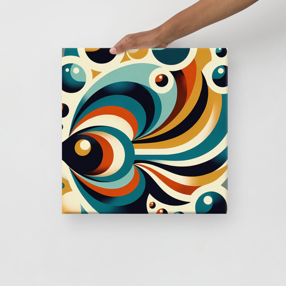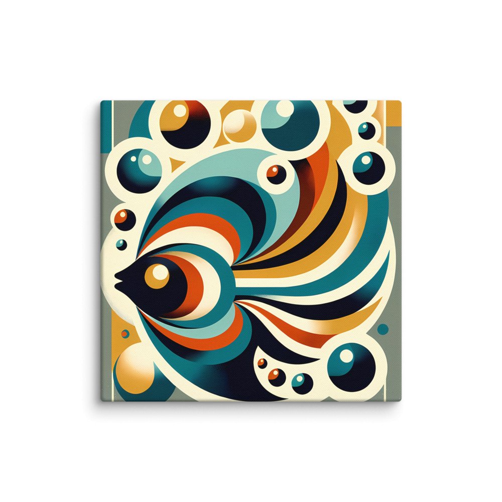 Retro Geometric Fish with Bubbles in Teal and Ochre — Canvas Print