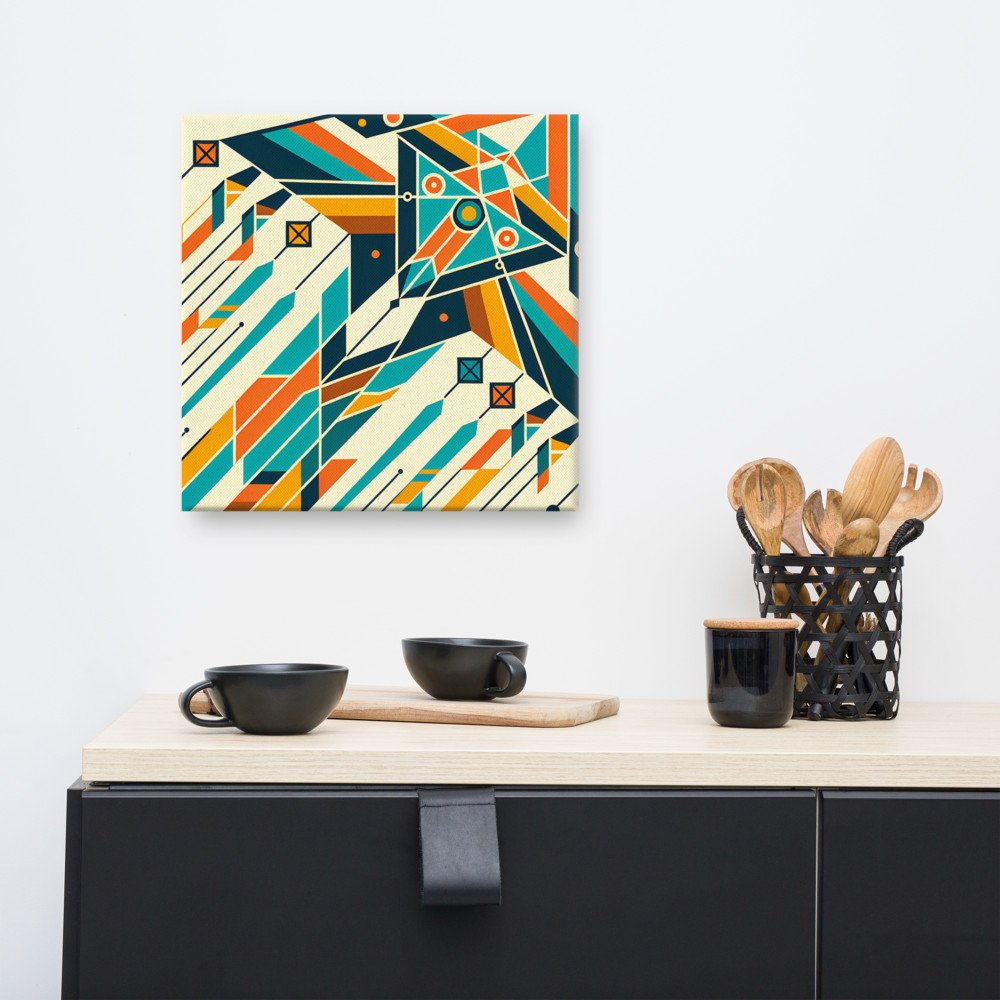 Mounted on a deep stretcher frame, this piece brings the angular composition's sense of motion directly onto your wall. The clean outlines and contrasting teal shapes hold their graphic impact from any viewing angle.