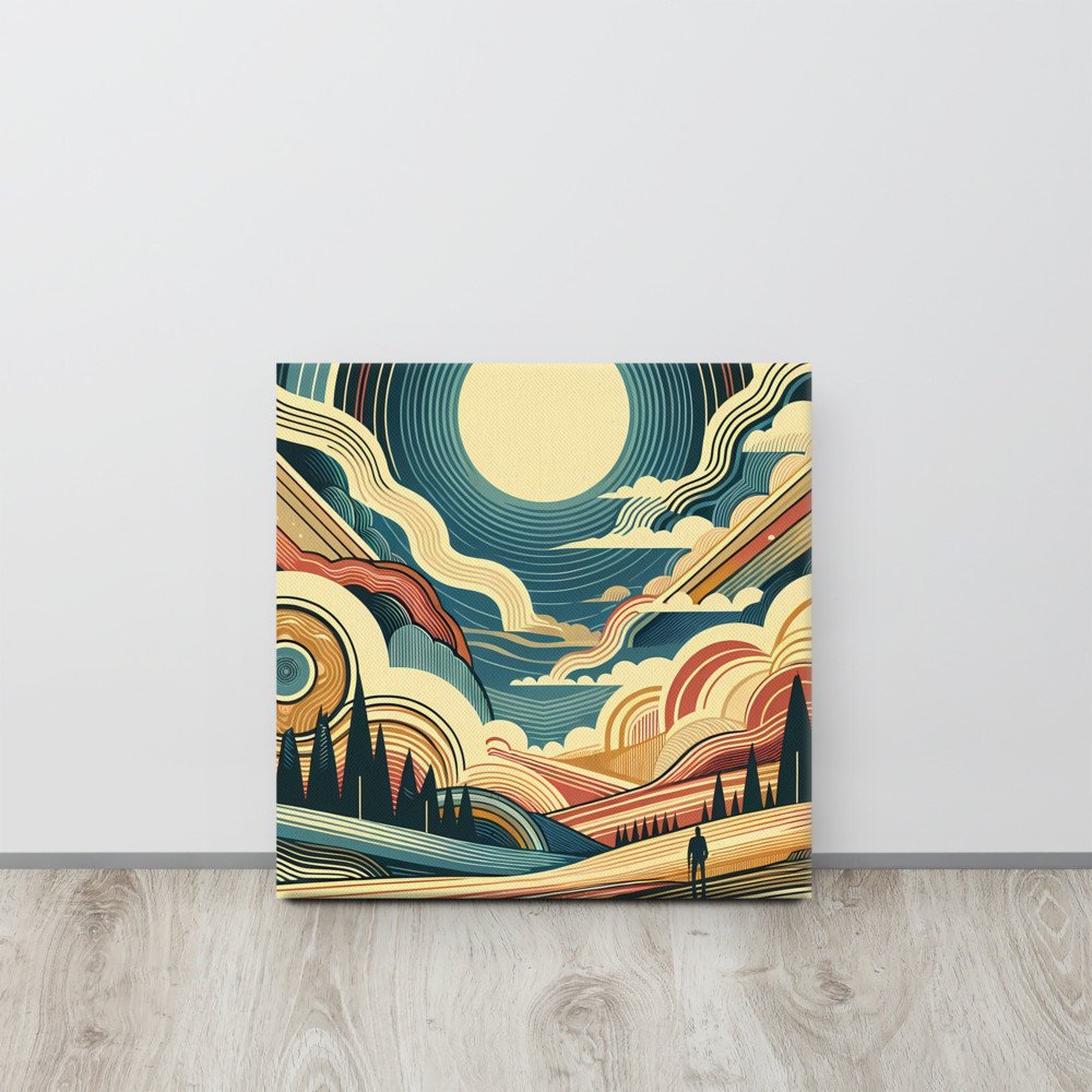 Retro mid century modern landscape illustration with a large sun, layered mountains and swirling geometric clouds. Bold abstract linework in teal, cream, mustard and burnt orange creates a vintage travel poster feel. A small silhouetted figure and dark pine trees add depth to the sweeping valley scene.