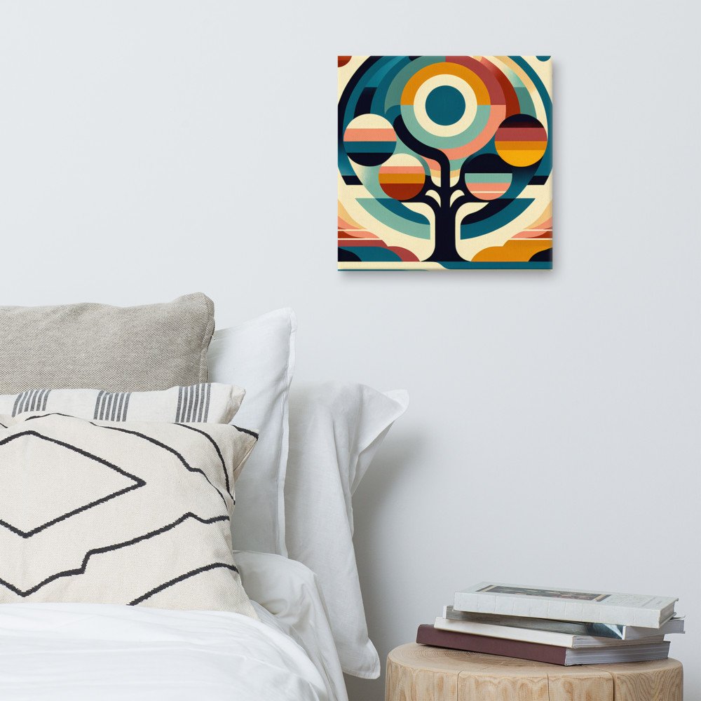 Retro Geometric Tree with Sun and Planet Orbs — Canvas Print