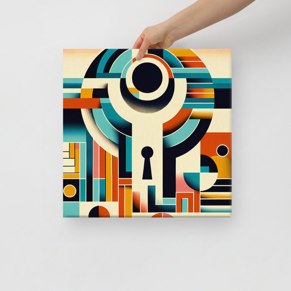 Mounted on a deep stretcher frame, this piece brings the architectural geometry directly onto your wall. The structured blocks and central keyhole form a substantial, ready-to-hang artwork with a distinctly mid-century character.
