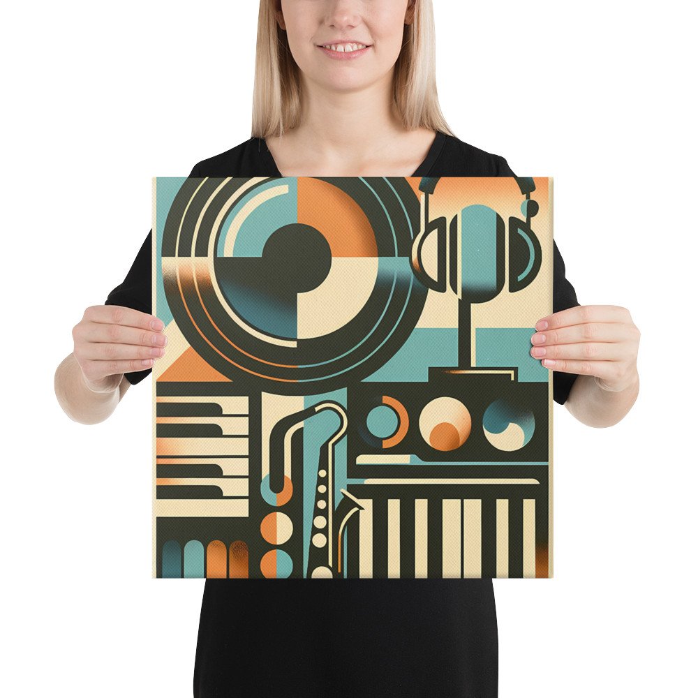 Sonic ReverieRetro Geometric Vinyl Record, Headphones and Piano Keys — Canvas Print