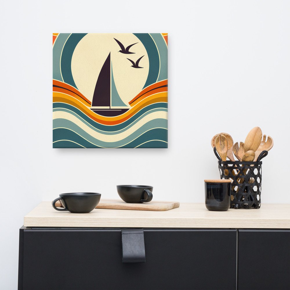 A minimal sailboat silhouette glides across layered waves beneath a bold circular sun, with two birds in flight. Curved bands in teal, beige, and warm orange create a clean, retro-inspired composition. A calm neutral abstract look with simple geometric shapes that nods to scandinavian design.