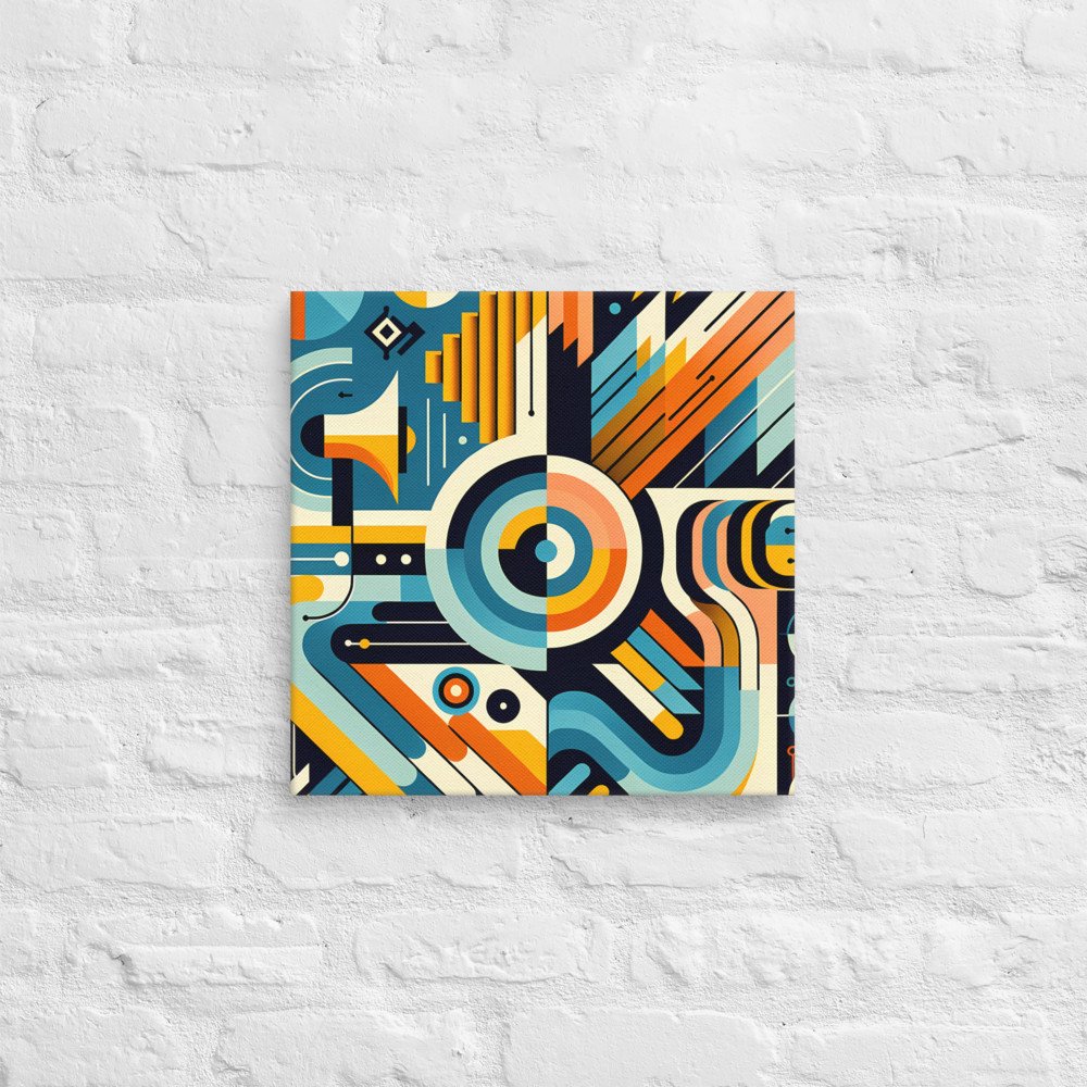 Mounted on a deep stretcher frame, this artwork commands attention on any wall. The sharp, poster-like composition of arcs and blocks in teal and orange gains a tangible, gallery-ready presence.