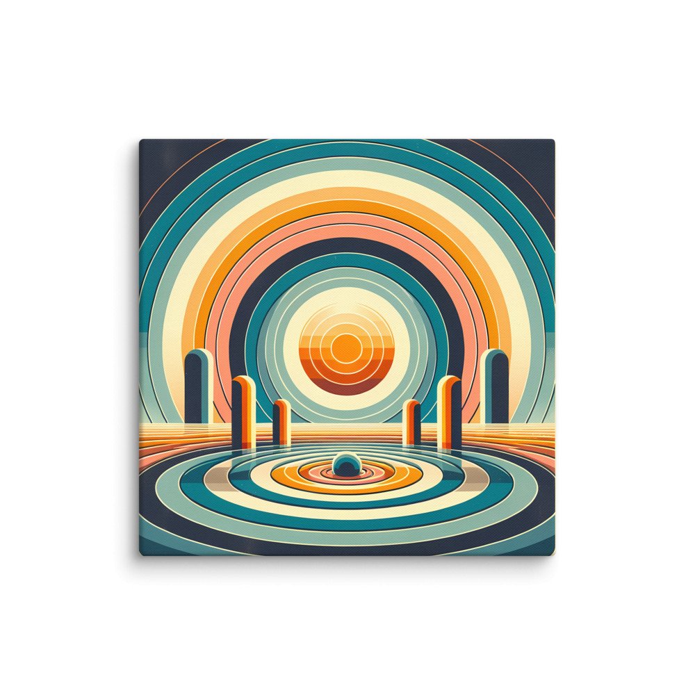 A stylised landscape built from concentric arcs and rings, centred on a glowing sun and rippling horizon. Teal, cream, coral and amber bands create a clean, geometric rhythm with a subtle grain texture. The composition echoes bold typography through stacked, graphic shapes and balanced negative space, like abstract type in a modern graphic print.