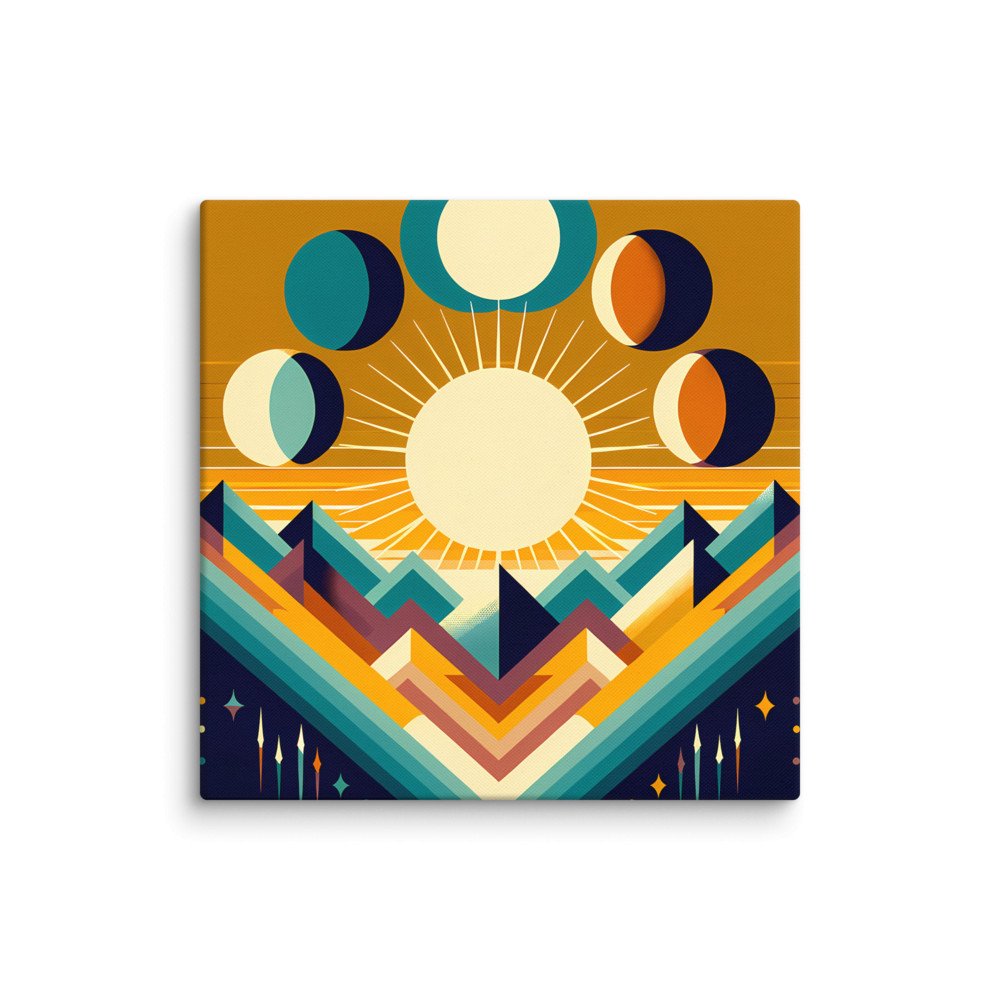 Geometric Sun and Moon Phases Over Mountains — Canvas Print