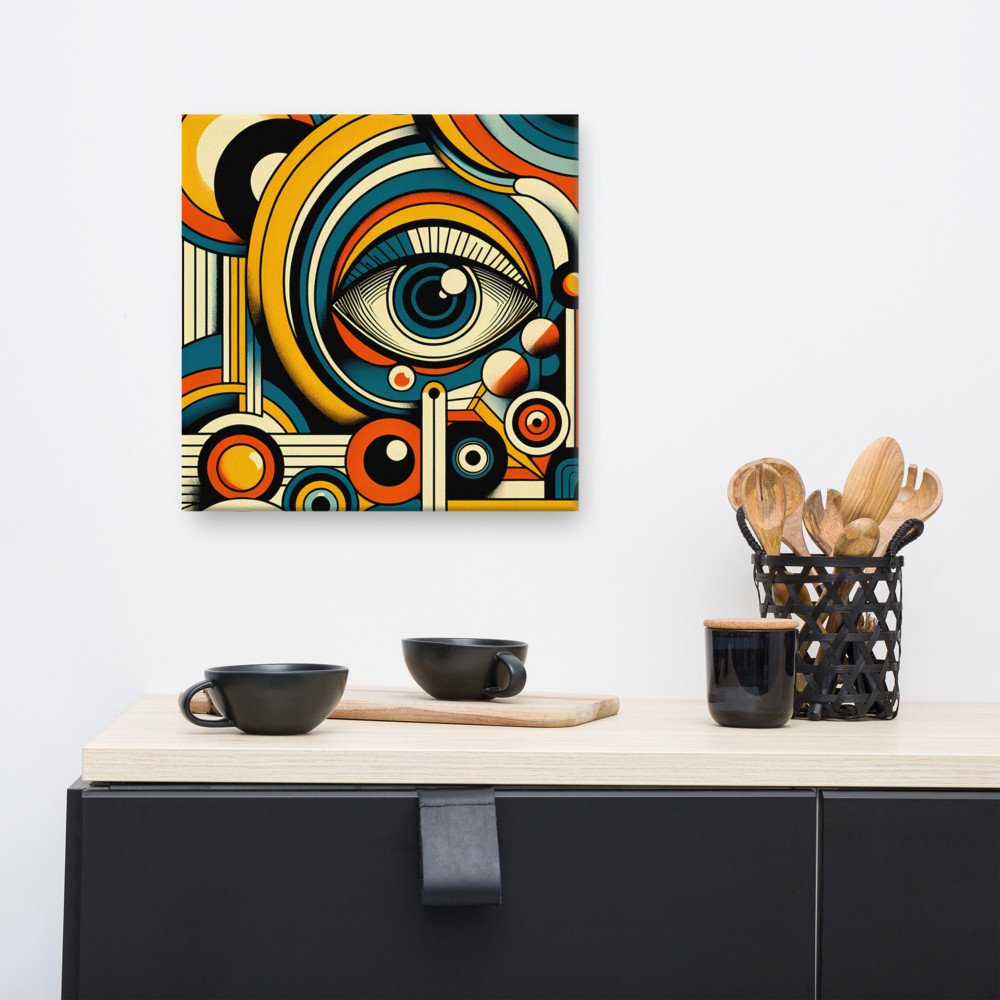 Mounted on a deep stretcher frame, this canvas presents the retro geometric composition as a ready-to-hang artwork. The clean lines and dot shading of the surreal eye motif create a focal point with a distinct mid-century modern character.