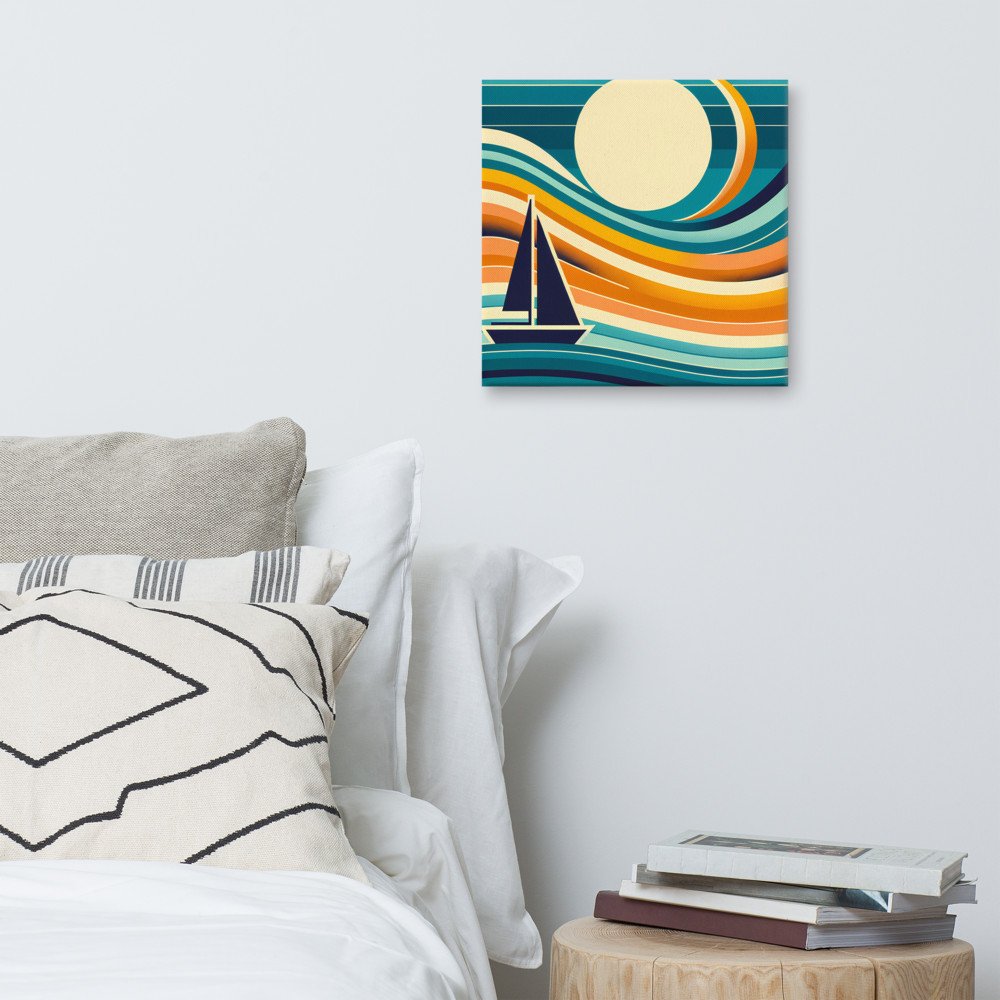 Geometric Sailboat in Gradient Sunset Waves — Canvas Print