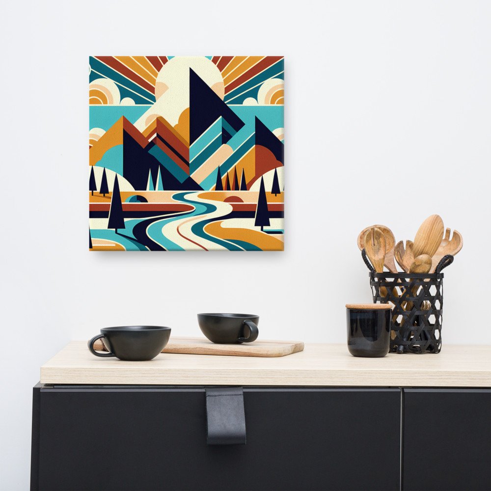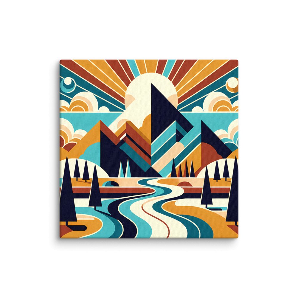 Rustic AscentGeometric Mountain Peaks with River and Sunburst — Canvas Print