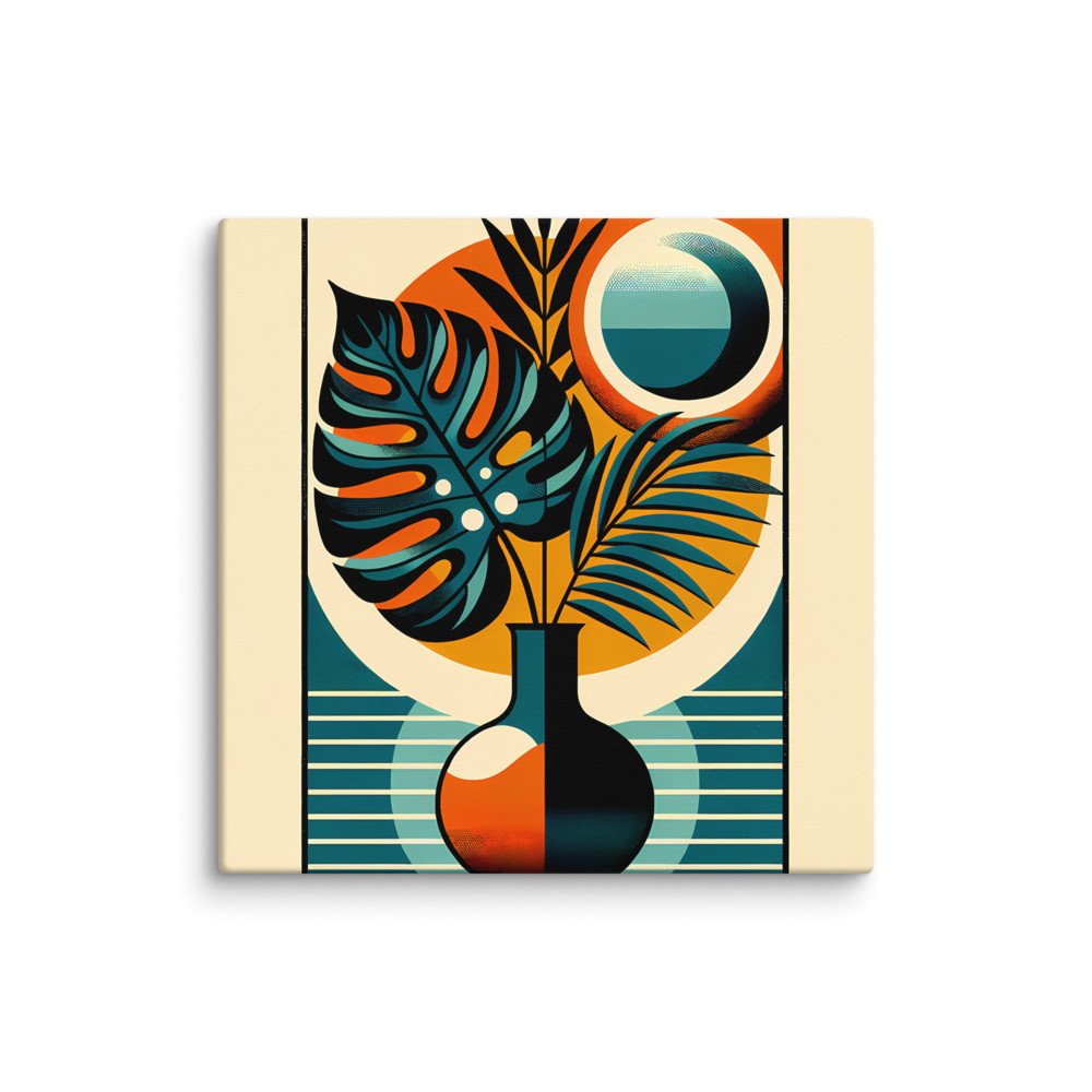 Bold tropical leaves arranged in a stylised vase with layered sun and moon shapes. Crisp geometric forms and halftone texture create an abstract botanical look in teal, orange, and cream. A modern, minimal plant art composition with strong mid-century inspired contrast.