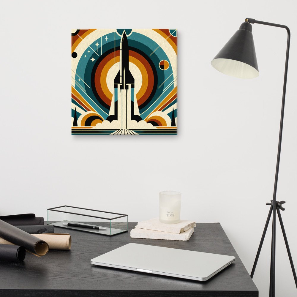 A stylised rocket launches upward through concentric geometric rings, framed by stars and planet-like circles. The design uses bold, clean shapes and a retro palette of teal, rust, mustard, black, and cream. Crisp symmetry and graphic text art energy give it a modern type poster feel without any words.