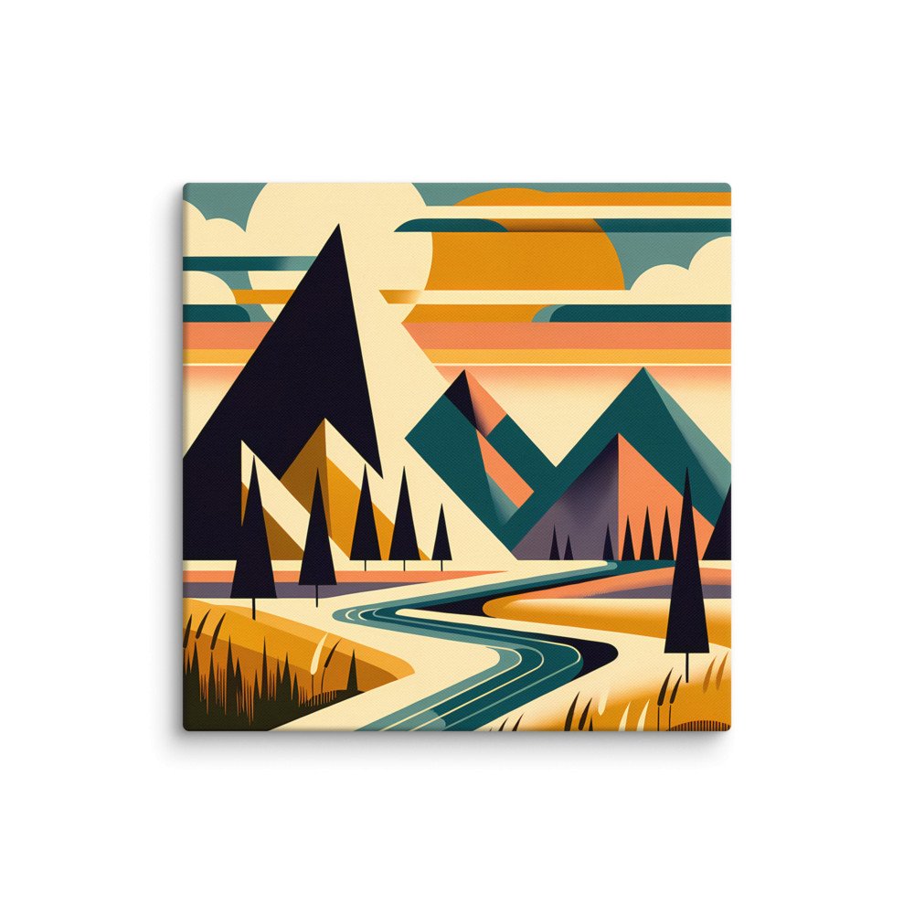 Geometric Mountain Landscape with River and Sunset — Canvas Print