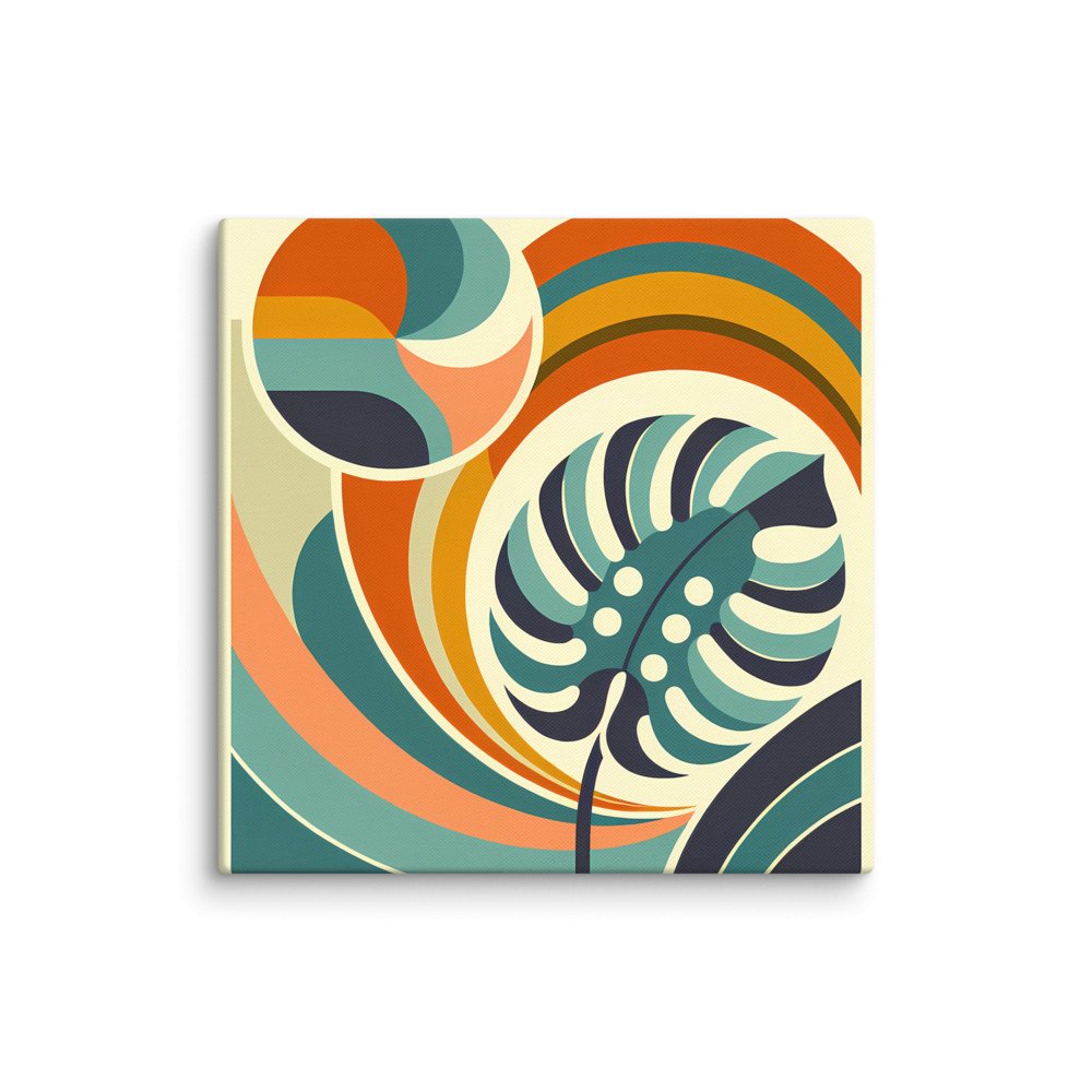 Abstract Monstera Leaf with Retro Rainbow Waves — Canvas Print