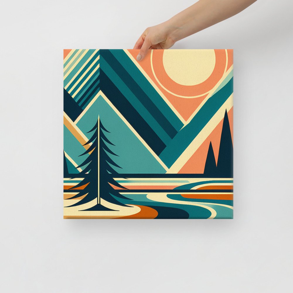 A stylised alpine scene with layered geometric mountains, a circular sun and a winding river in bold retro tones. Sharp triangular forms and clean bands of colour create a striking triangle landscape with strong line mountain details. Teal, cream and burnt orange shapes give the composition a crisp minimal outdoors feel.