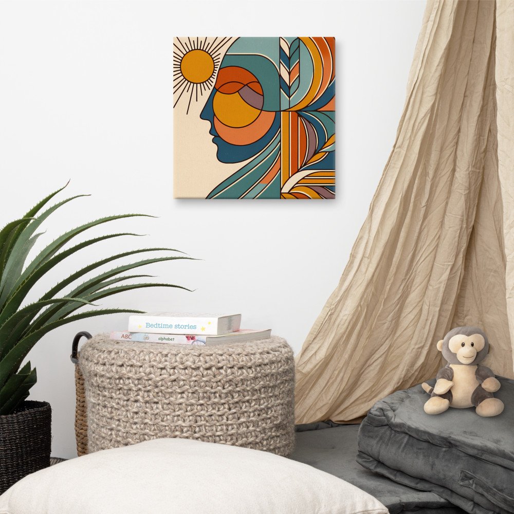 A stylised portrait combines a side-profile face with a radiant sun, layered arches and flowing botanical forms. Bold geometric shapes and warm retro colours create a modern minimal composition with an abstract portrait line feel. The textured finish and clean contours give it a refined line drawing aesthetic.