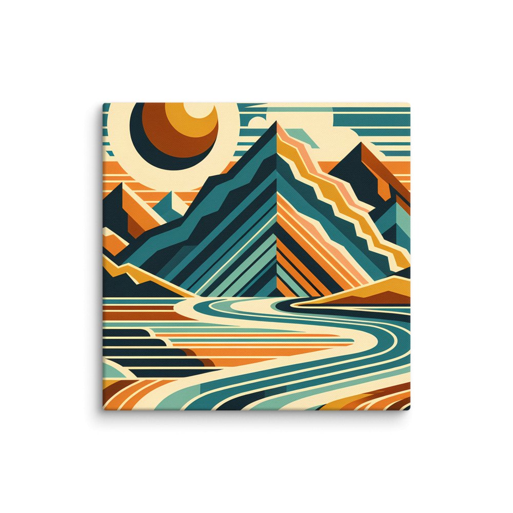 A stylised mountain scene with a winding river, striped skies and a bold crescent sun in teal, orange and cream. Layered shapes and terrain lines give it the feel of contour map art, blending a vintage palette with clean geometric forms.