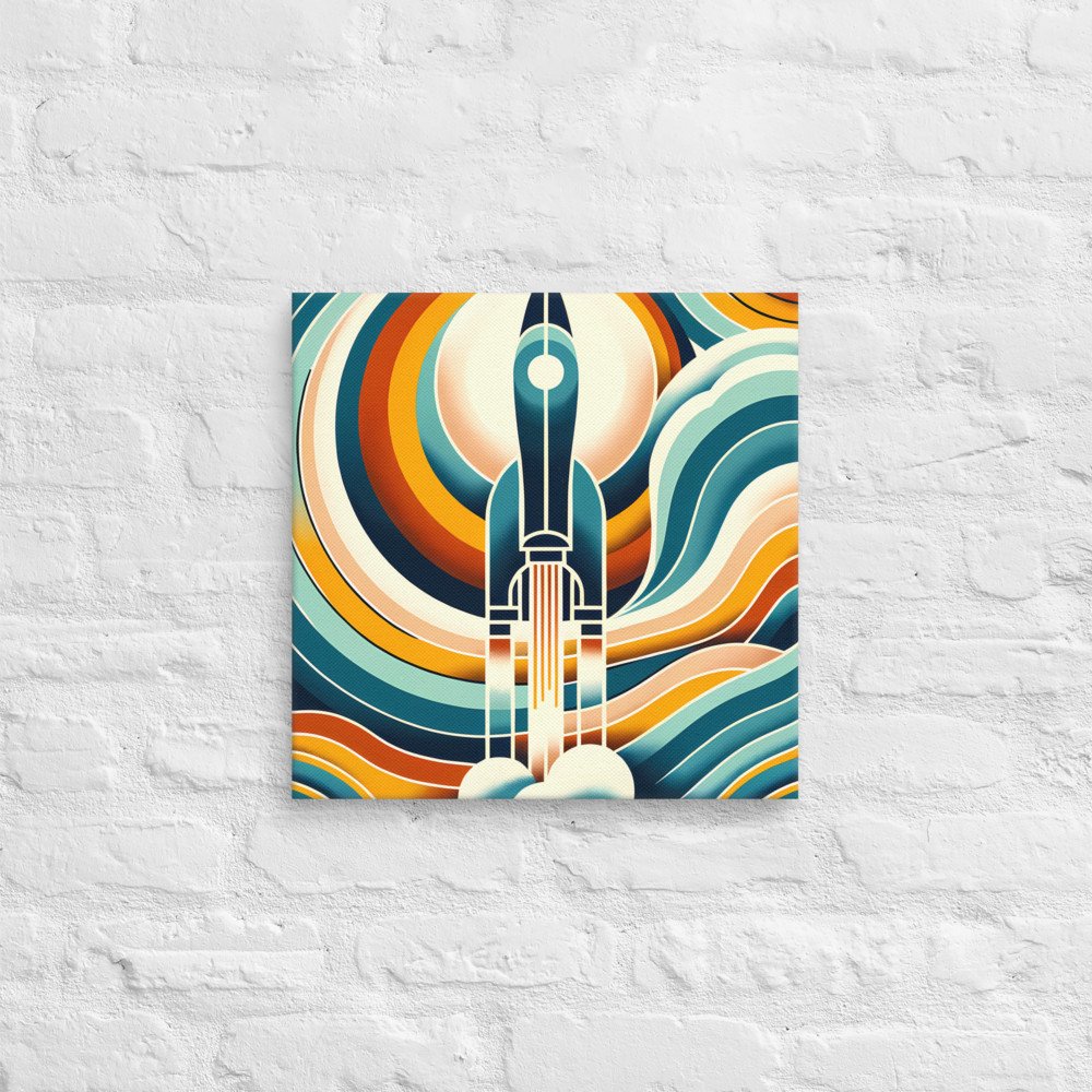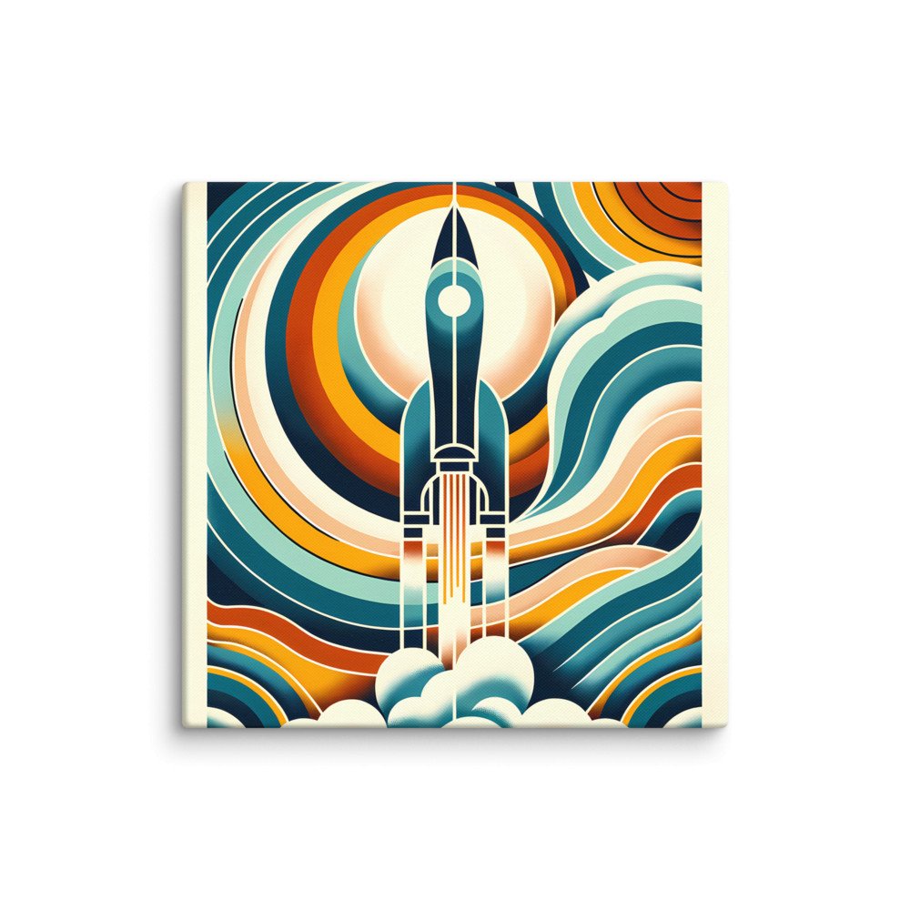 Mounted on a deep stretcher frame, this artwork brings the dynamic geometry of the rocket launch into your space. The layered teal waves and circular bands create a striking, ready-to-hang focal point with a retro-futurist feel.