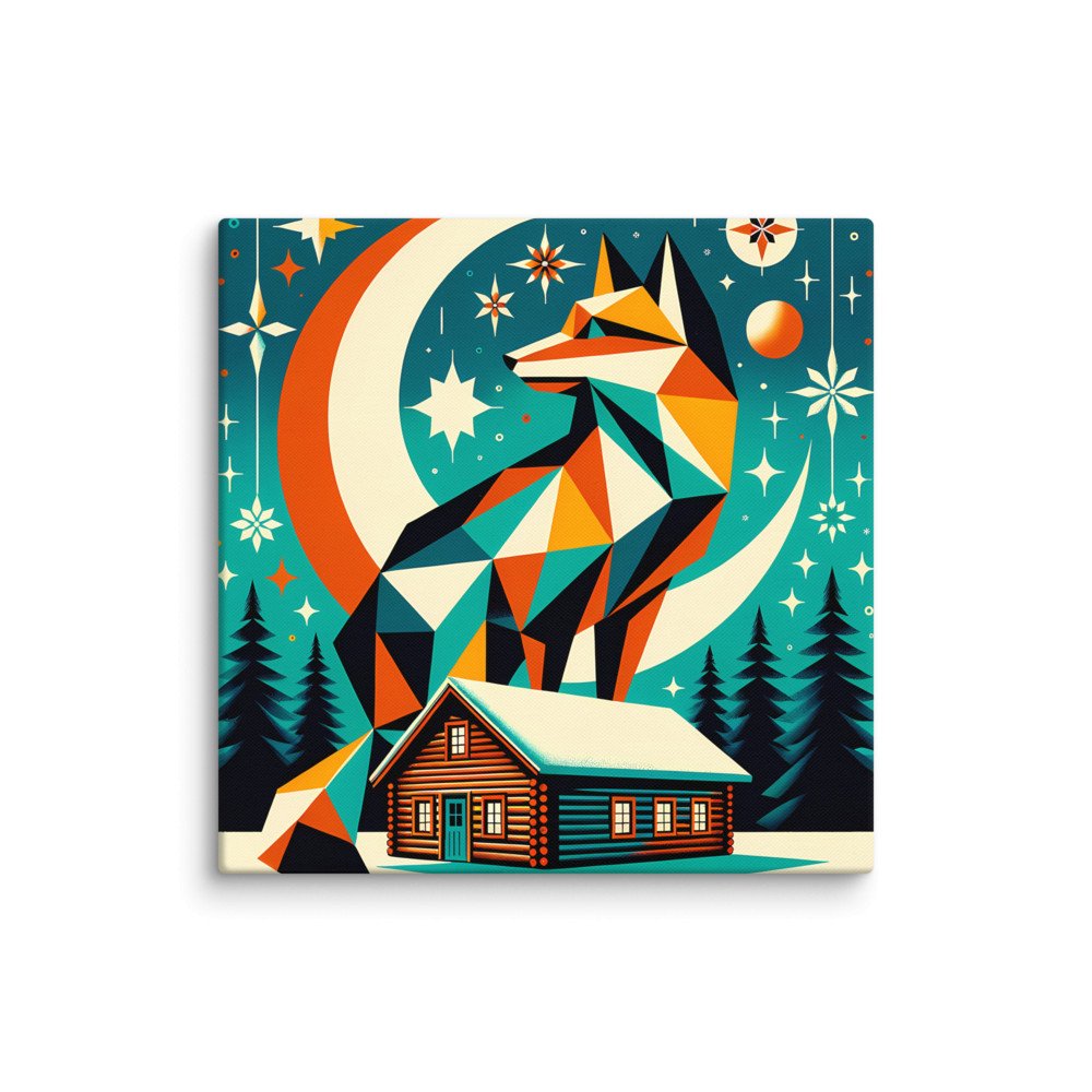 A geometric fox stands before a glowing crescent moon above a snow-covered cabin and dark pine trees. The bold angular shapes and cold colour palette create a striking winter minimalist look with hints of abstract snowflakes and scandi winter styling.