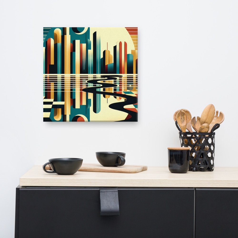 A stylised skyline rises against a split sun with mirrored forms, striped horizons and a winding dark path through the centre. Bold teal, cream, gold and rust tones create a modern abstract composition with strong geometric rhythm. Checker grid elements and clean symmetry give the scene an op art minimal feel.