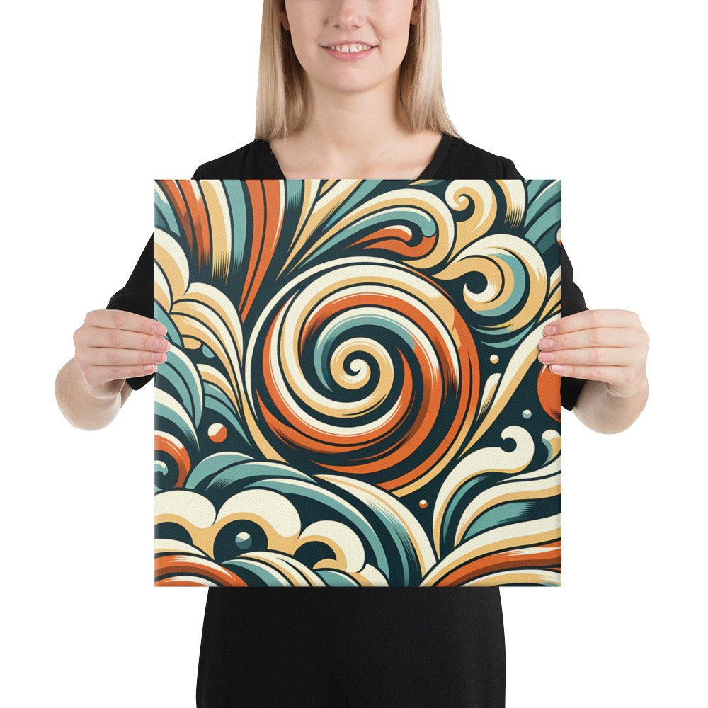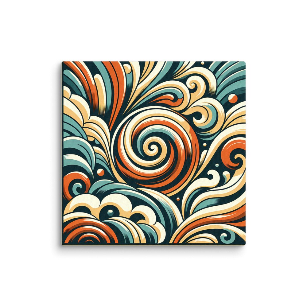 Mounted on a deep 1.25" frame, this gallery-wrapped canvas presents the layered geometric flow as a ready-to-hang artwork. The retro swirls in teal, cream and orange establish a bold, graphic presence in any room.