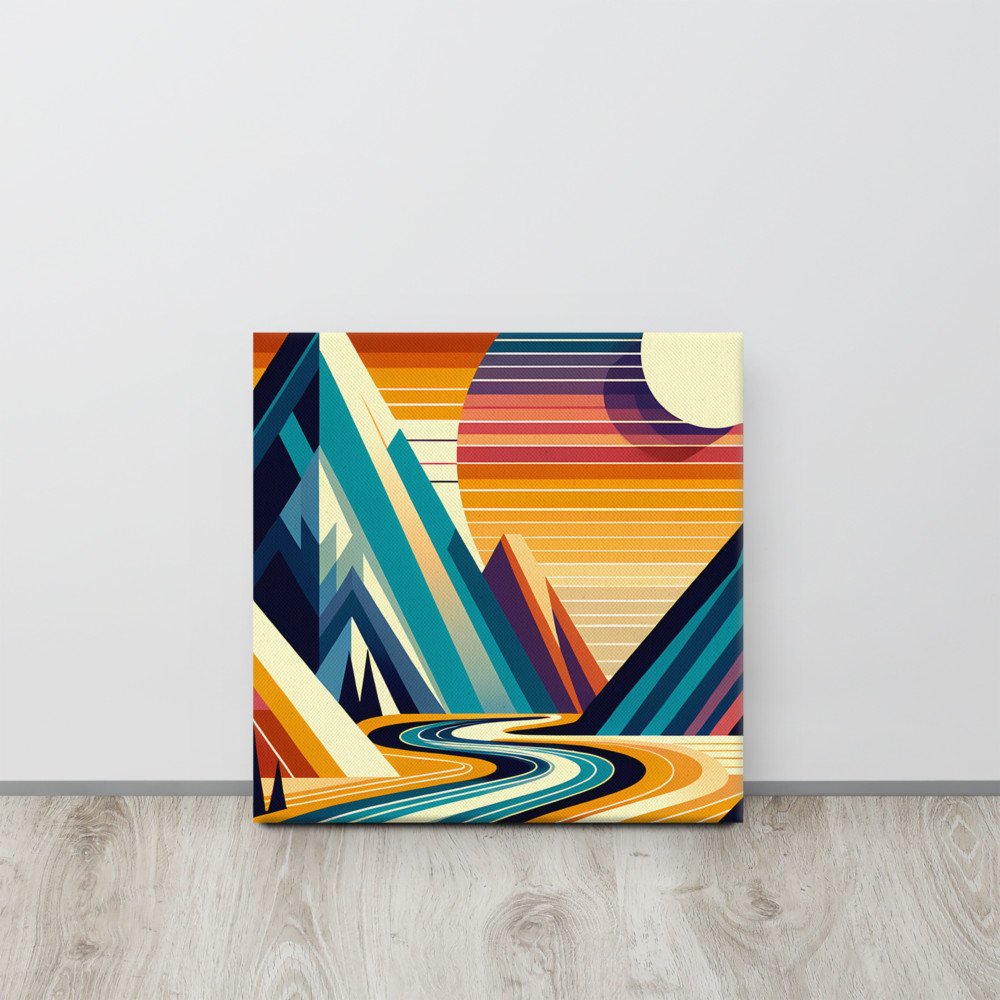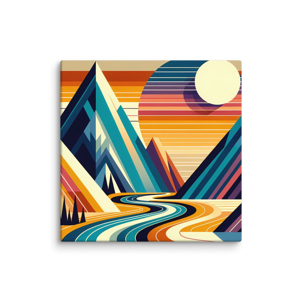 Mounted on a deep stretcher frame, this artwork brings layered peaks and a striped sun directly onto your wall. The strong colour contrast and clean lines give the composition a substantial, modern presence in any room.