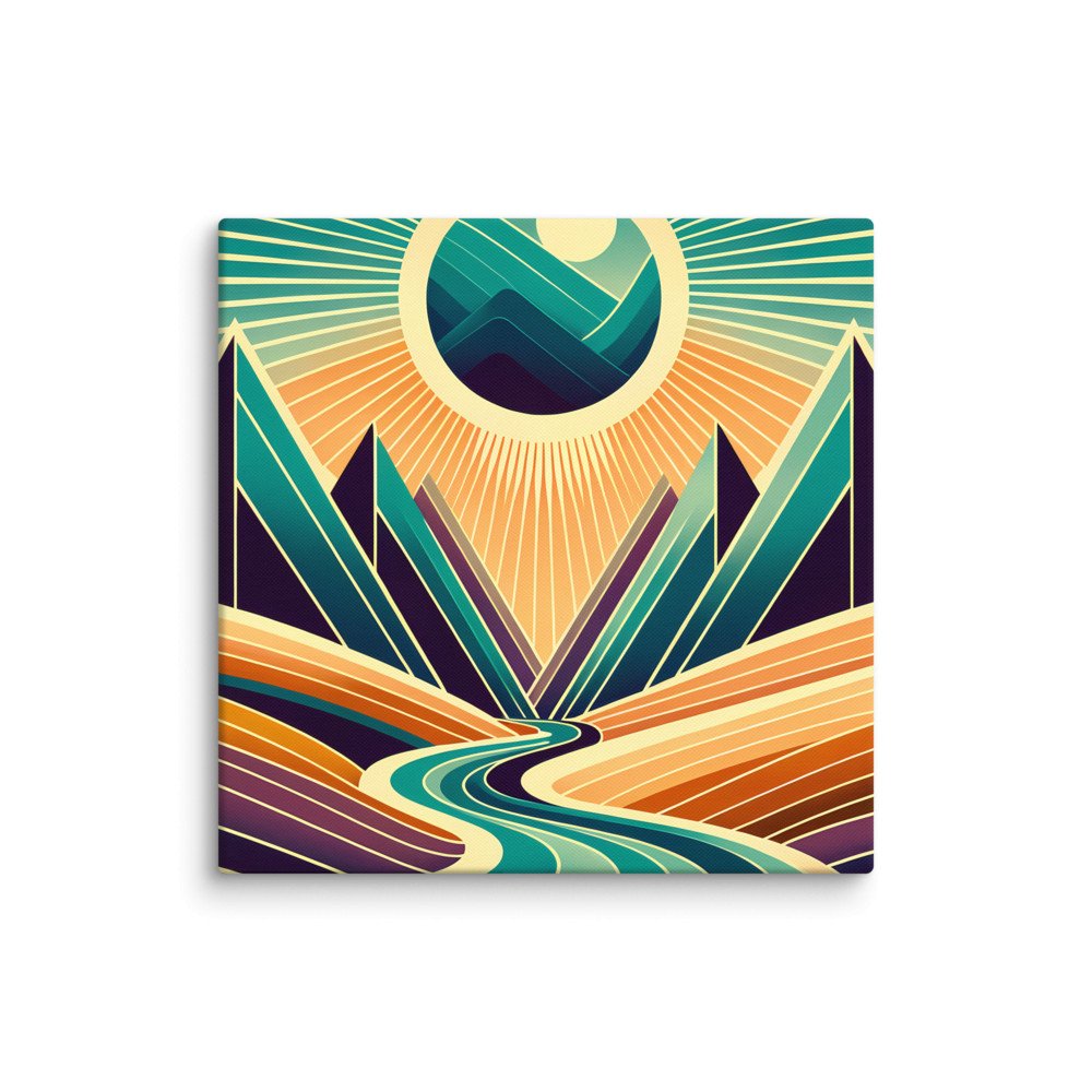 Mounted on a deep stretcher frame, this canvas print gives the layered mountain forms a commanding physical presence. The radiant sun and sharp geometry project a calm, structured depth, ready to bring a focal point of modern abstraction to your wall.