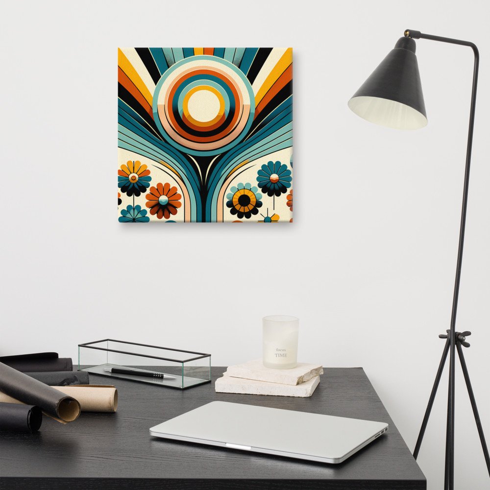 A bold geometric flowers composition with a radiant circular sunburst and stylised blooms in teal, orange, cream and black. Clean symmetry, layered arcs and graphic petals give it a striking abstract botanical look with a retro modern feel.