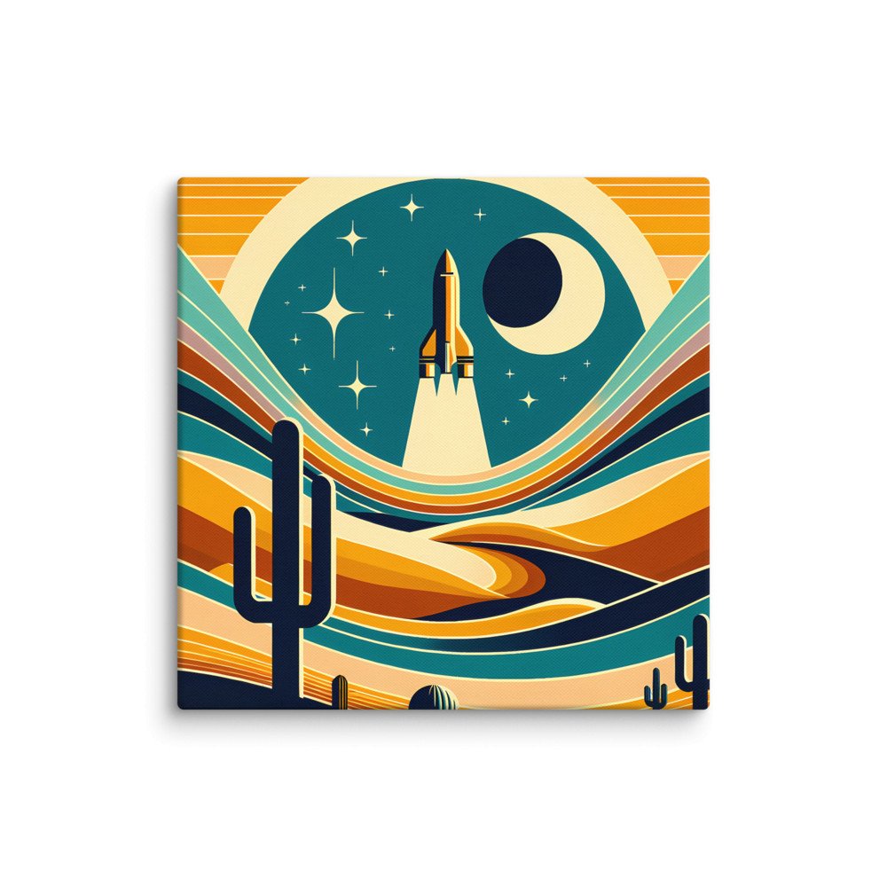 Saffron OrbitRetro rocket over desert moonscape — Canvas Print