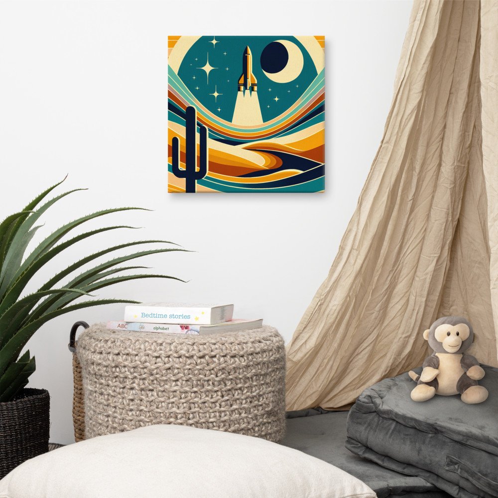 Mounted on a deep 1.25" frame, this canvas brings the stylised rocket scene into your space with tangible depth. The composition's curved layers of teal and amber offer a sleek, mid-century feel, ready to hang as a focal point.