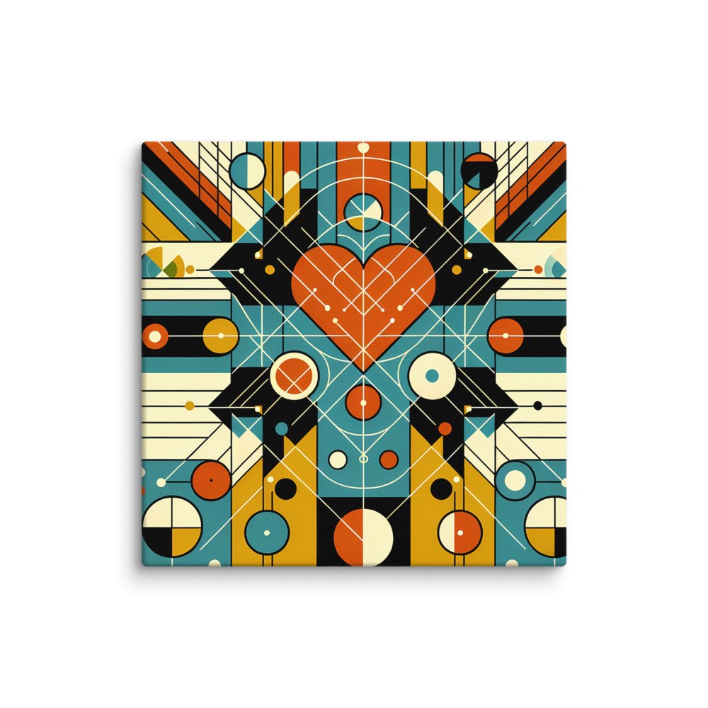 Mounted on a deep 1.25" frame, this ready-to-hang canvas gives the abstract composition a tangible, textured presence. The geometric heart structure, rendered in a striking mid-century palette, becomes a focal point with gallery-ready depth.