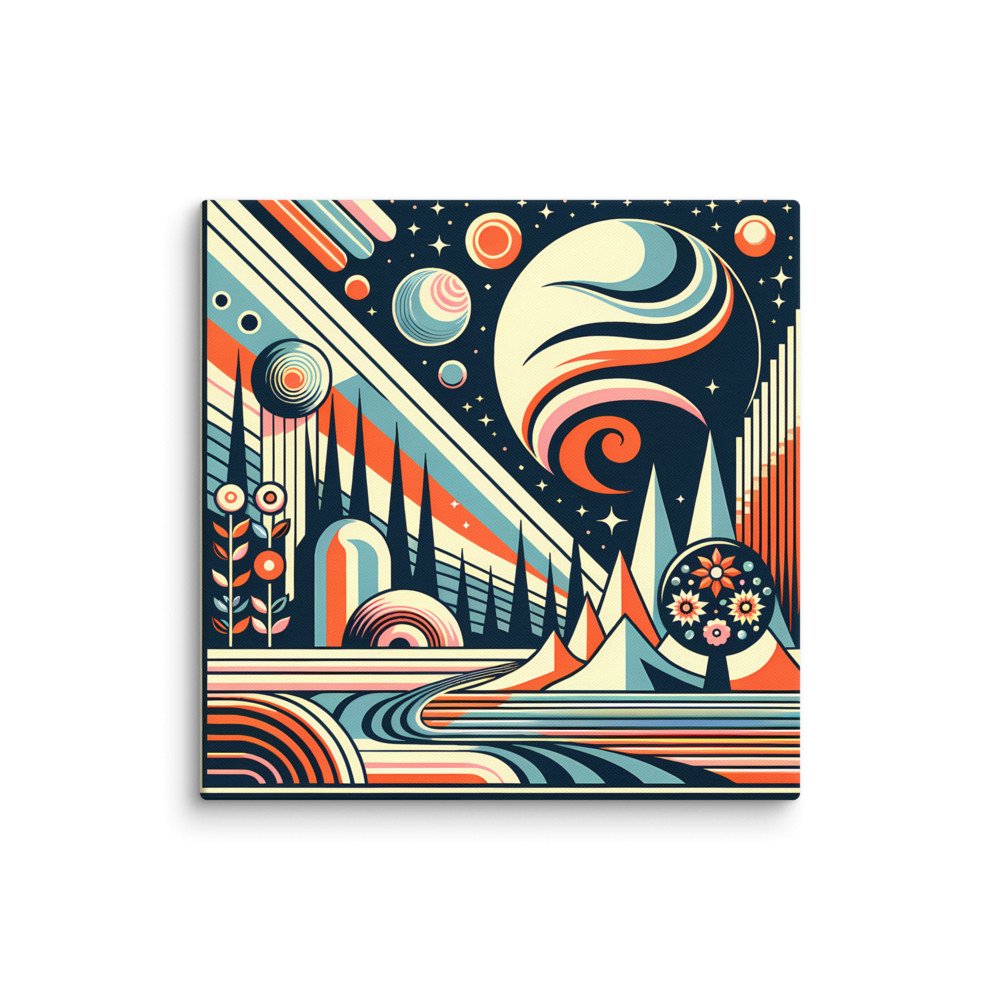 Nebula PathwayRetro Space Landscape with Planets and Geometric Peaks — Canvas Print