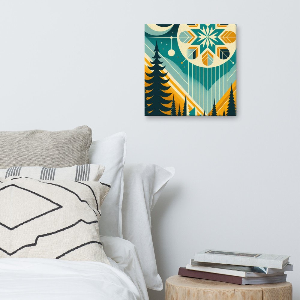 Mounted on a deep stretcher frame, this artwork brings structured winter quietude to your wall. The geometric snowflake and layered mountains in a cool palette are presented with clean, gallery-ready precision.