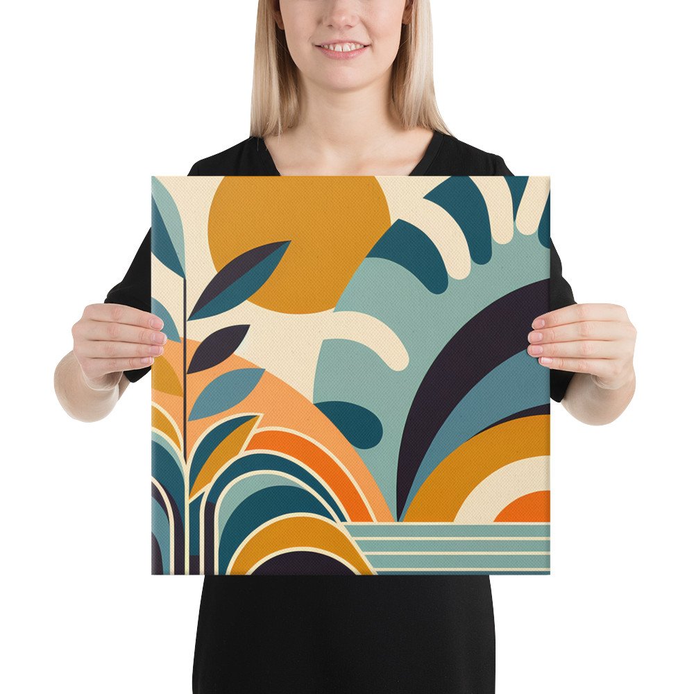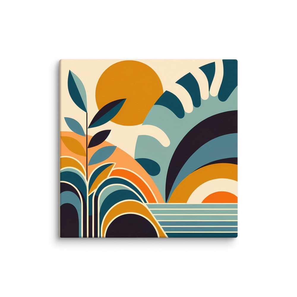 Mounted on a deep, ready-to-hang frame, this canvas print gives the layered botanical artwork a tangible presence. The teal, ochre and peach tones of the sun forms and arches achieve a clean, retro-inspired balance that commands attention on any wall.