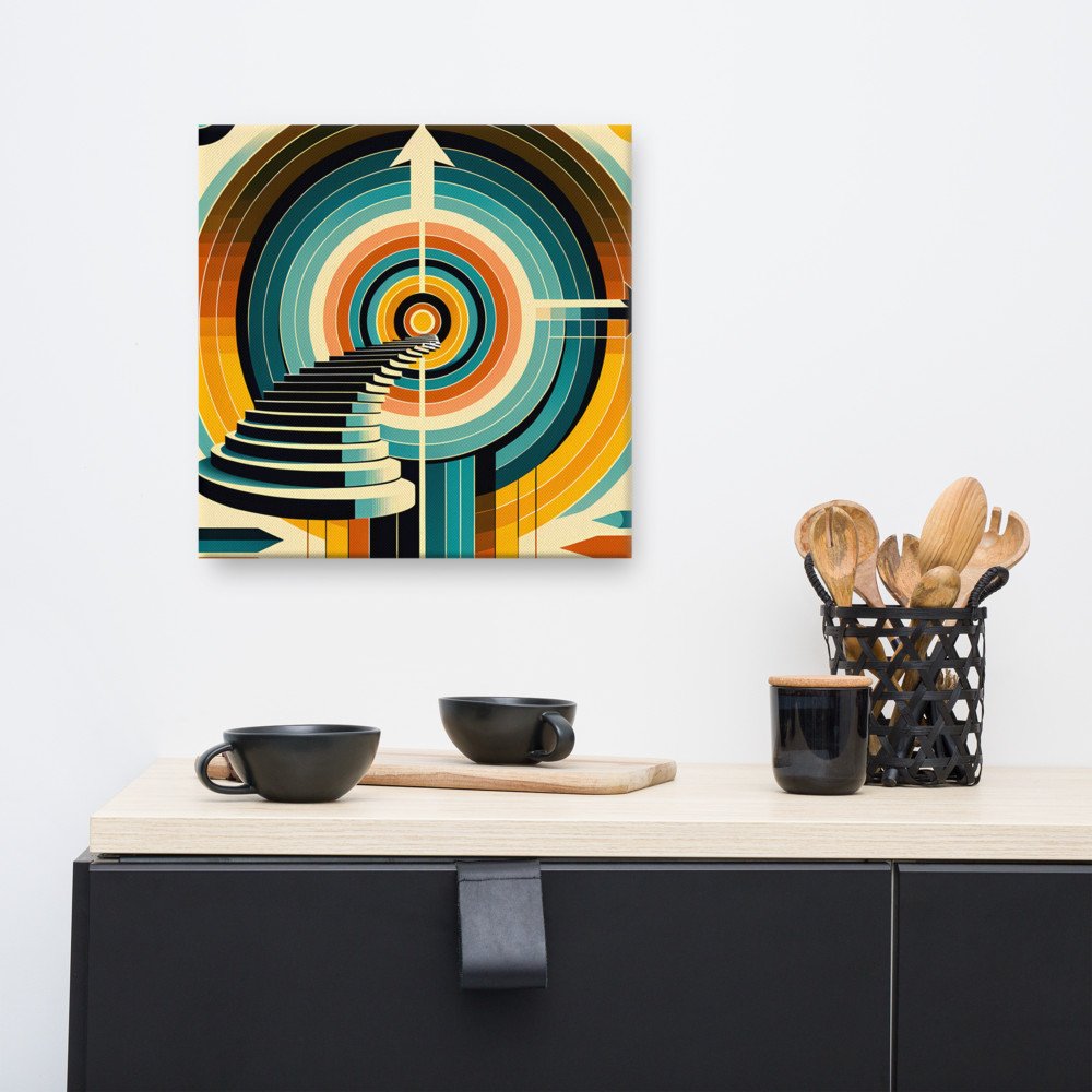 Stretched over 1.25-inch bars, this square canvas gives the stairway’s symmetrical composition a sculptural presence on the wall. The teal and ochre arcs seem to push forward against the deep navy background, creating depth without needing a frame. Ready to hang in a living room or study.