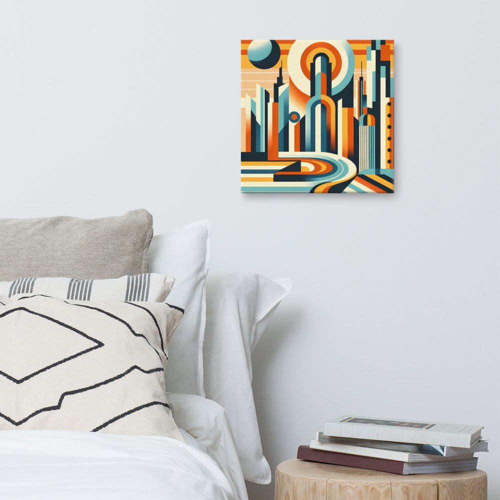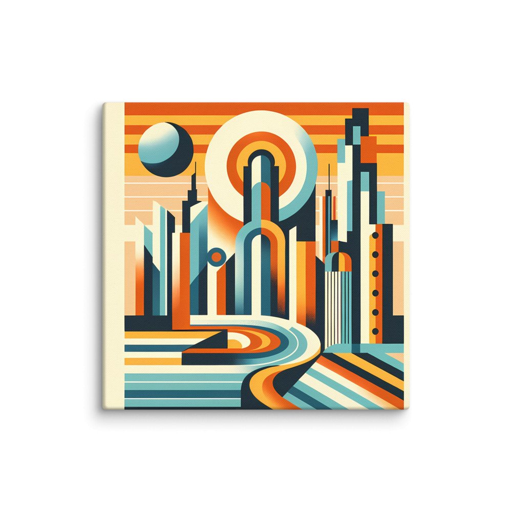 Urban MirageRetro Futurist Cityscape with Sun and Curved Road — Canvas Print