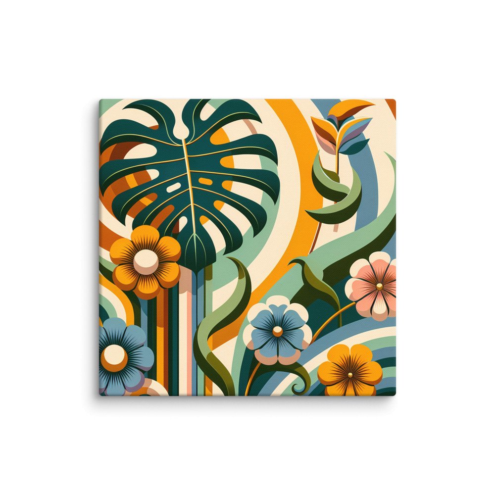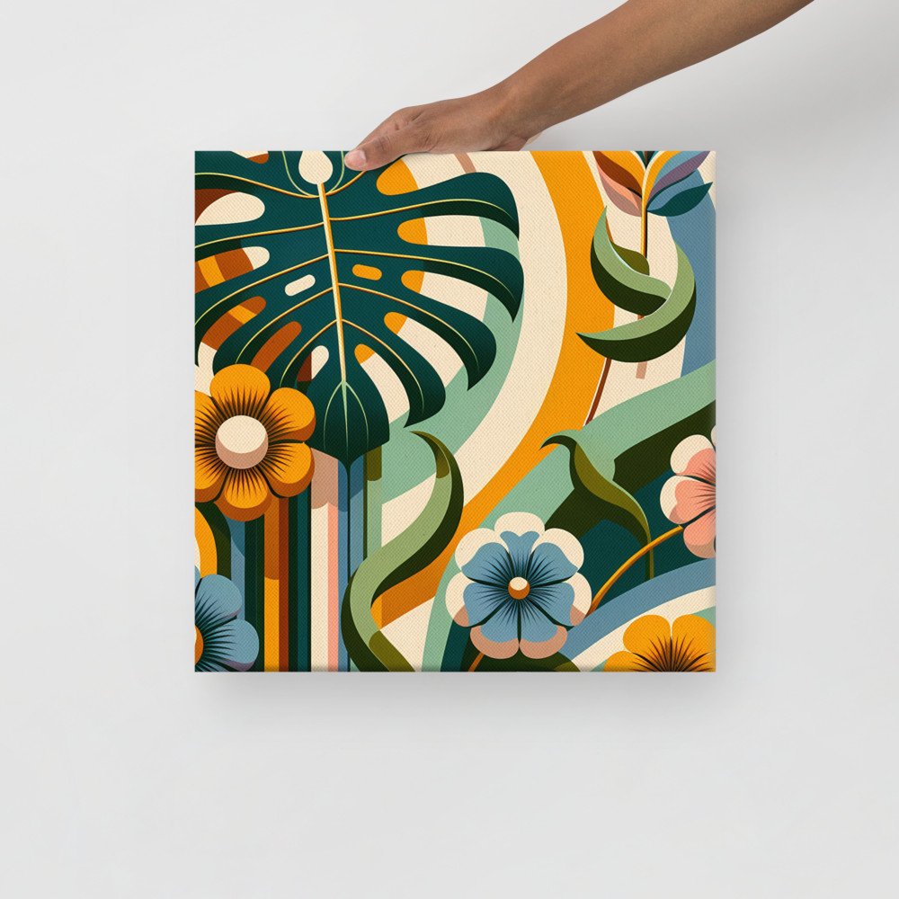 Mounted on a deep stretcher frame, this canvas brings the abstract botanical composition into a room. Its smooth, retro-modern bands of colour and organic shapes form a self-contained focal point.