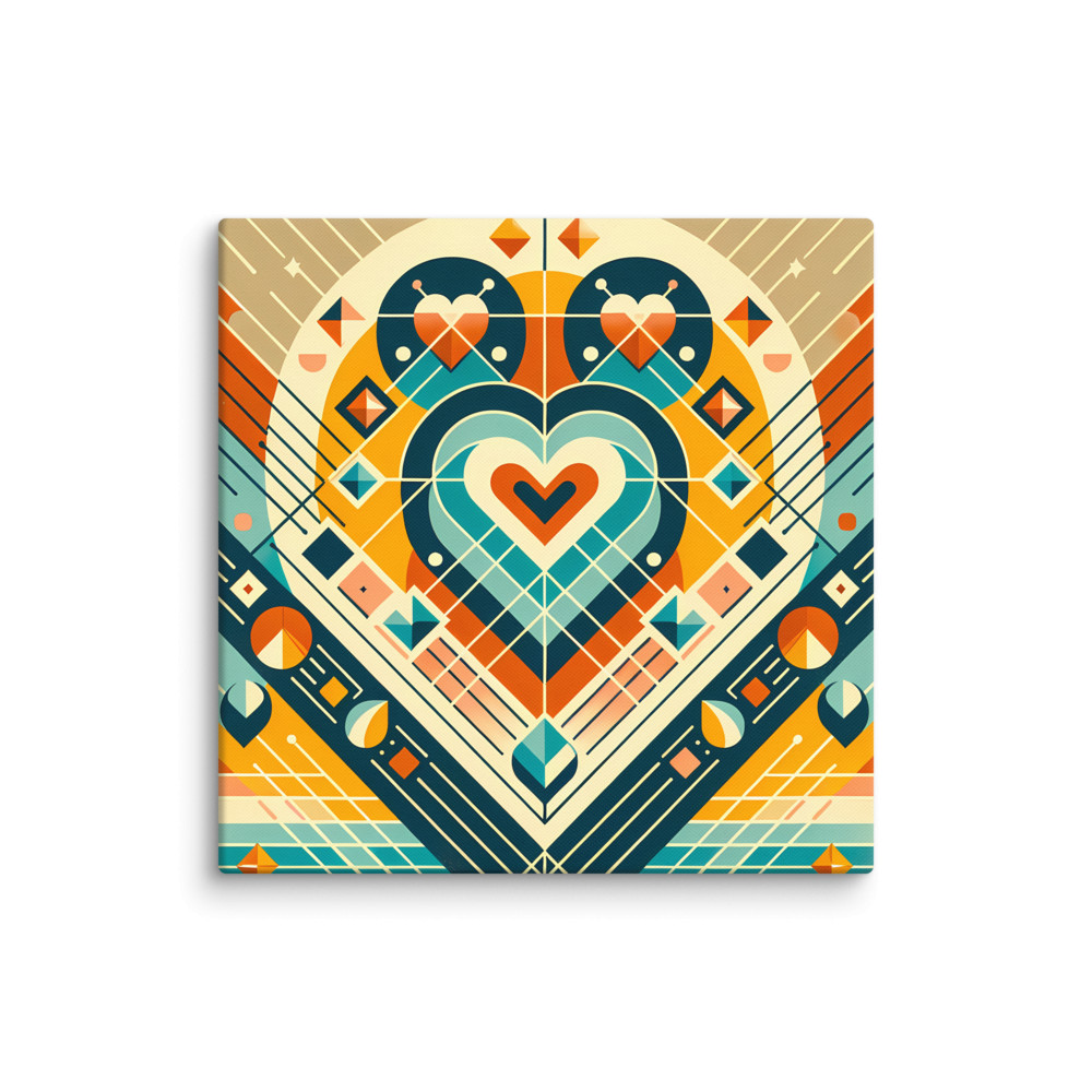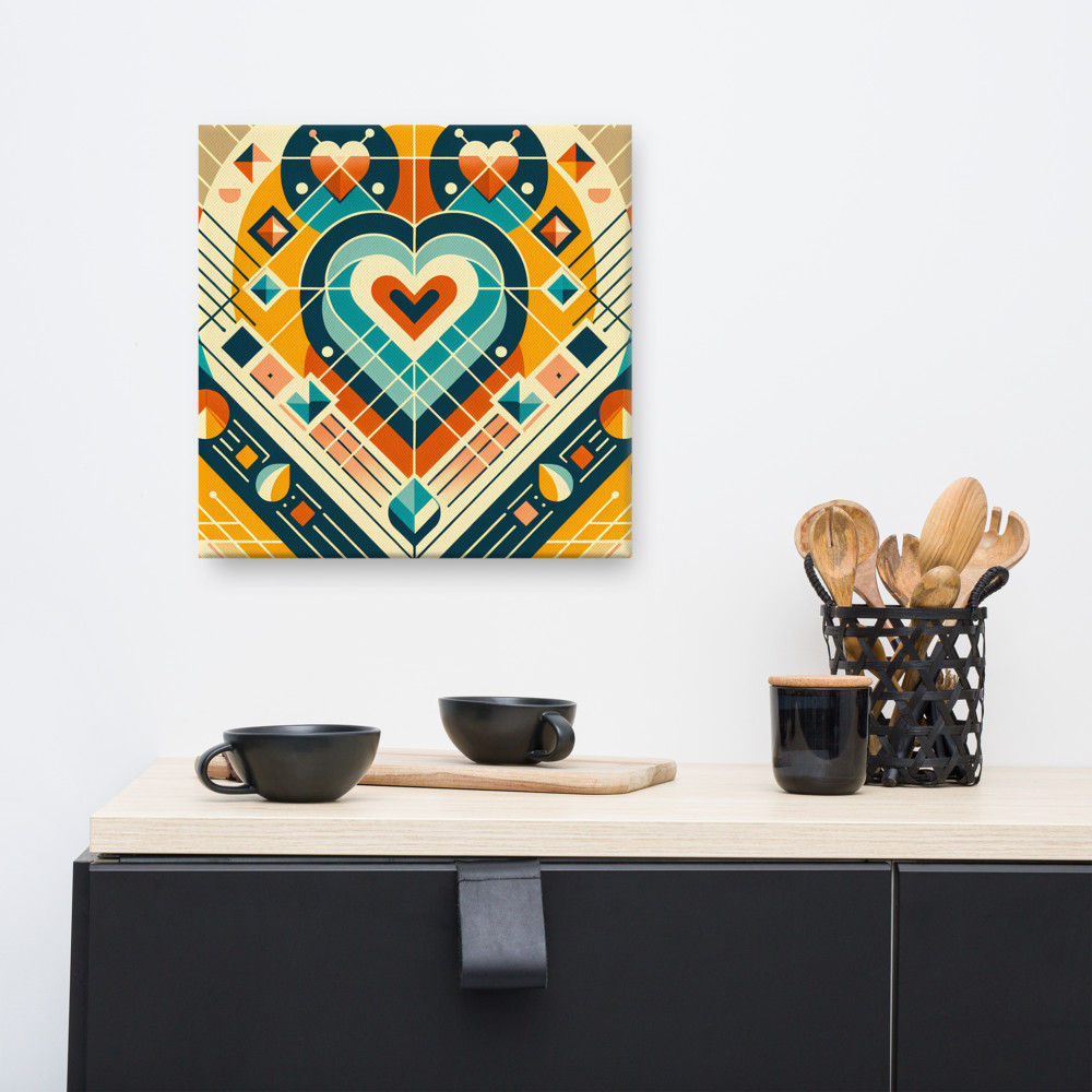 Stretched over 1.25-inch bars, the gallery-wrapped canvas brings the layered heart and its surrounding diamonds directly into your space. Teal and amber dominate the composition, with coral and cream accents softening the geometric precision. Ready to hang in a 12-to-20-inch square format, it suits a mid-century modern alcove or bedroom wall.