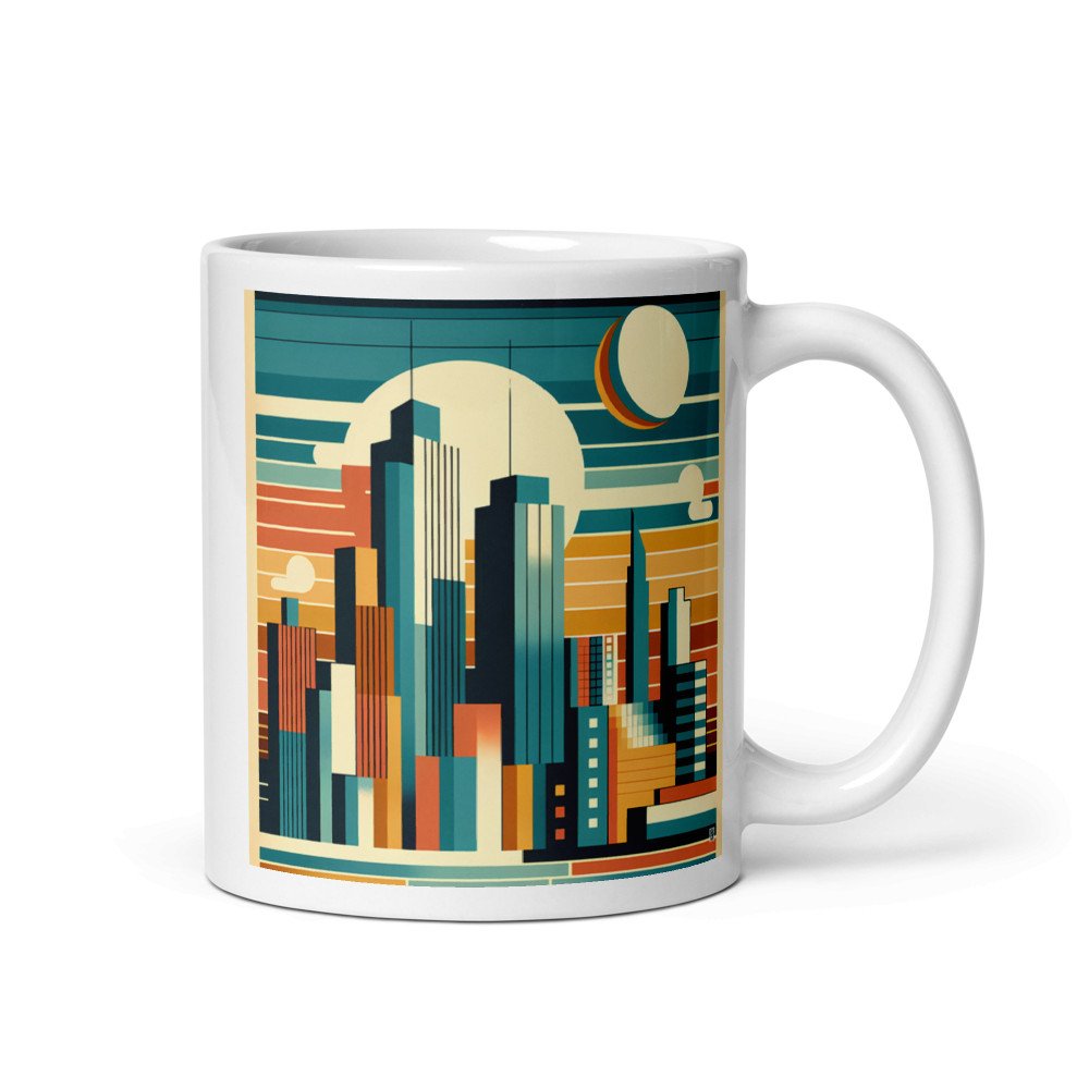 The glossy ceramic surface allows the wraparound print to shine, turning your morning routine into a moment of retro style. Enjoy the crisp geometry of the striped sunset sky and abstract skyline with every sip from this durable, dishwasher-safe mug.