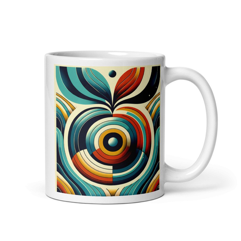 This glossy ceramic mug features a wraparound print of dynamic teal and orange geometry. The vibrant pattern, with its concentric circles, turns an everyday drink into a moment of retro style.