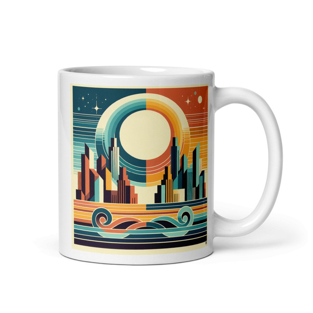 The glossy ceramic surface showcases the symmetrical skyline and its bold, circular sun. Your hand wraps around the curve of this dishwasher-safe mug, mirroring the design's own waves and stripes with each use.
