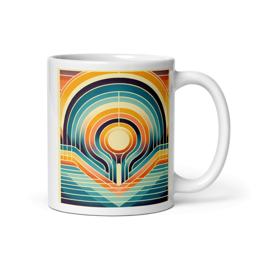 A bold geometric composition of layered arches radiating from a central sun, built from clean lines and concentric shapes. Warm orange and golden tones contrast with teal and navy bands for a vintage-inspired palette. The structured layout echoes modern graphic text art and bold typography aesthetics without using words.