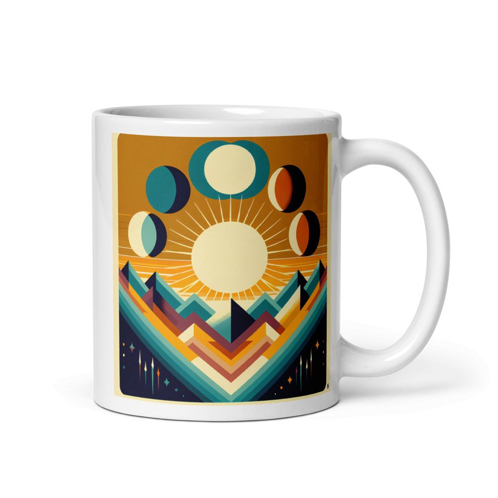 Geometric Sun and Moon Phases Over Mountains — Mug