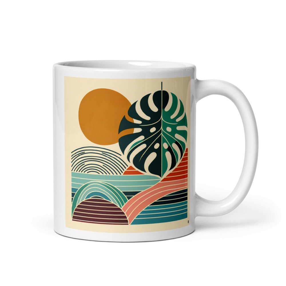 Verdant ReverieAbstract Monstera Leaf with Sun and Geometric Waves — Mug