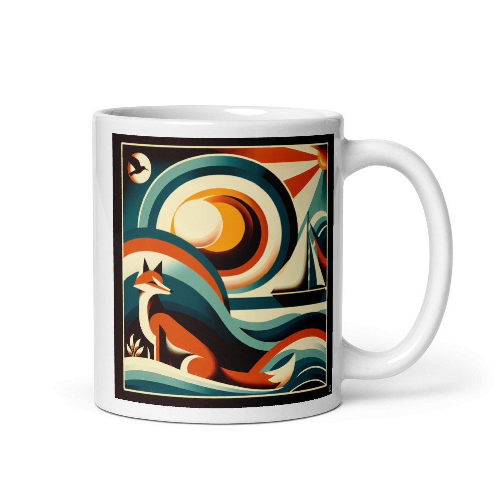 A stylised fox rests among flowing wave shapes beneath a bold, concentric sunset, with a sailboat and sunbeams on the horizon. The palette mixes teal, cream, orange and deep navy with a textured, screenprint-style finish. The composition leans into bold typography-inspired geometry for a clean, modern graphic print feel.