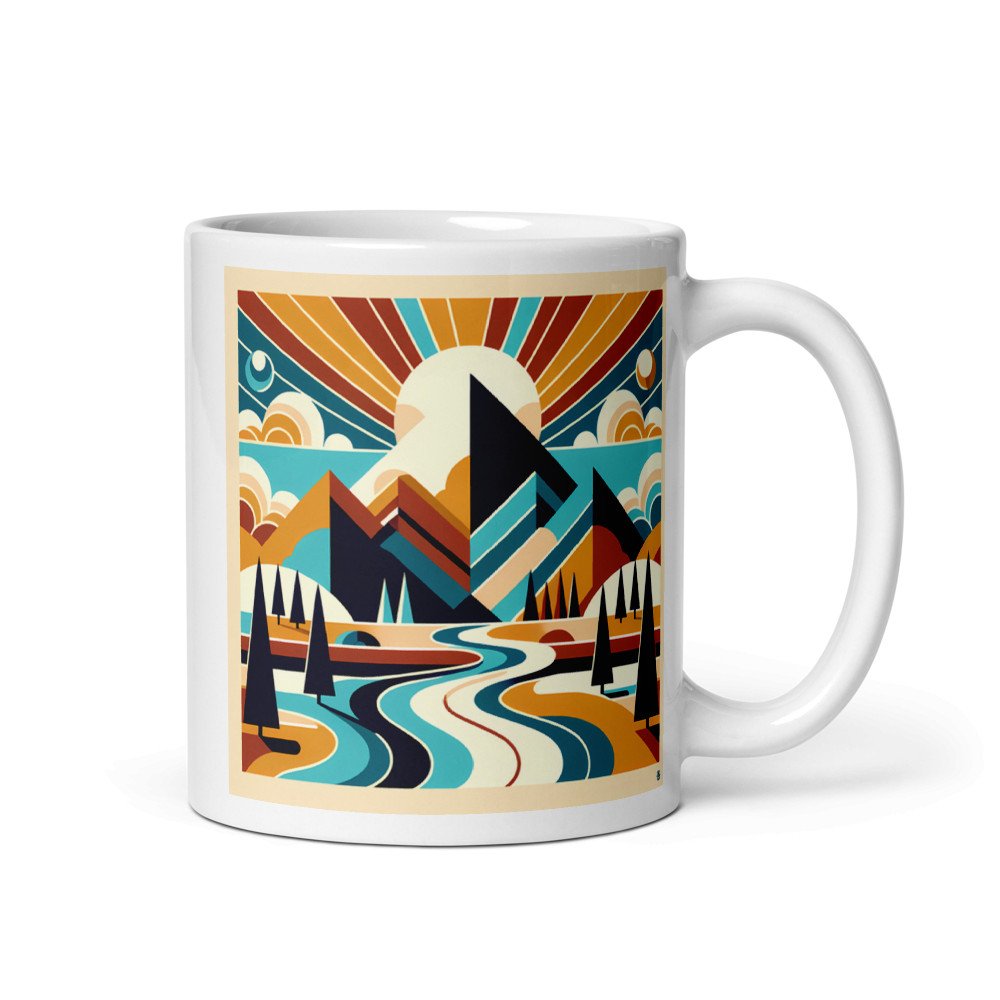 Geometric Mountain Peaks with River and Sunburst — Mug