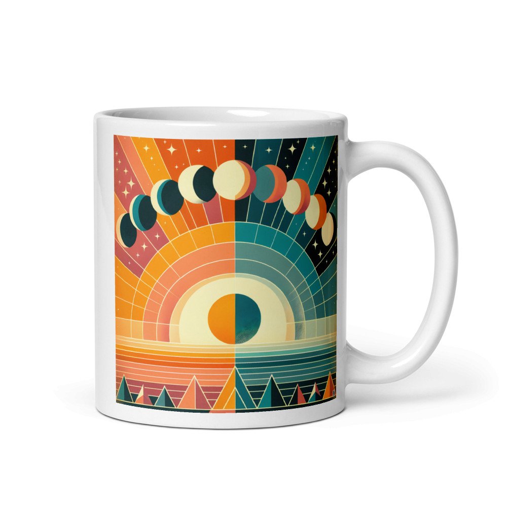 This glossy ceramic mug holds your favourite drink within its wraparound scene. The bold illustration of arcing moons and a radiant sun-disc offers a moment of retro-inspired contemplation with each sip.