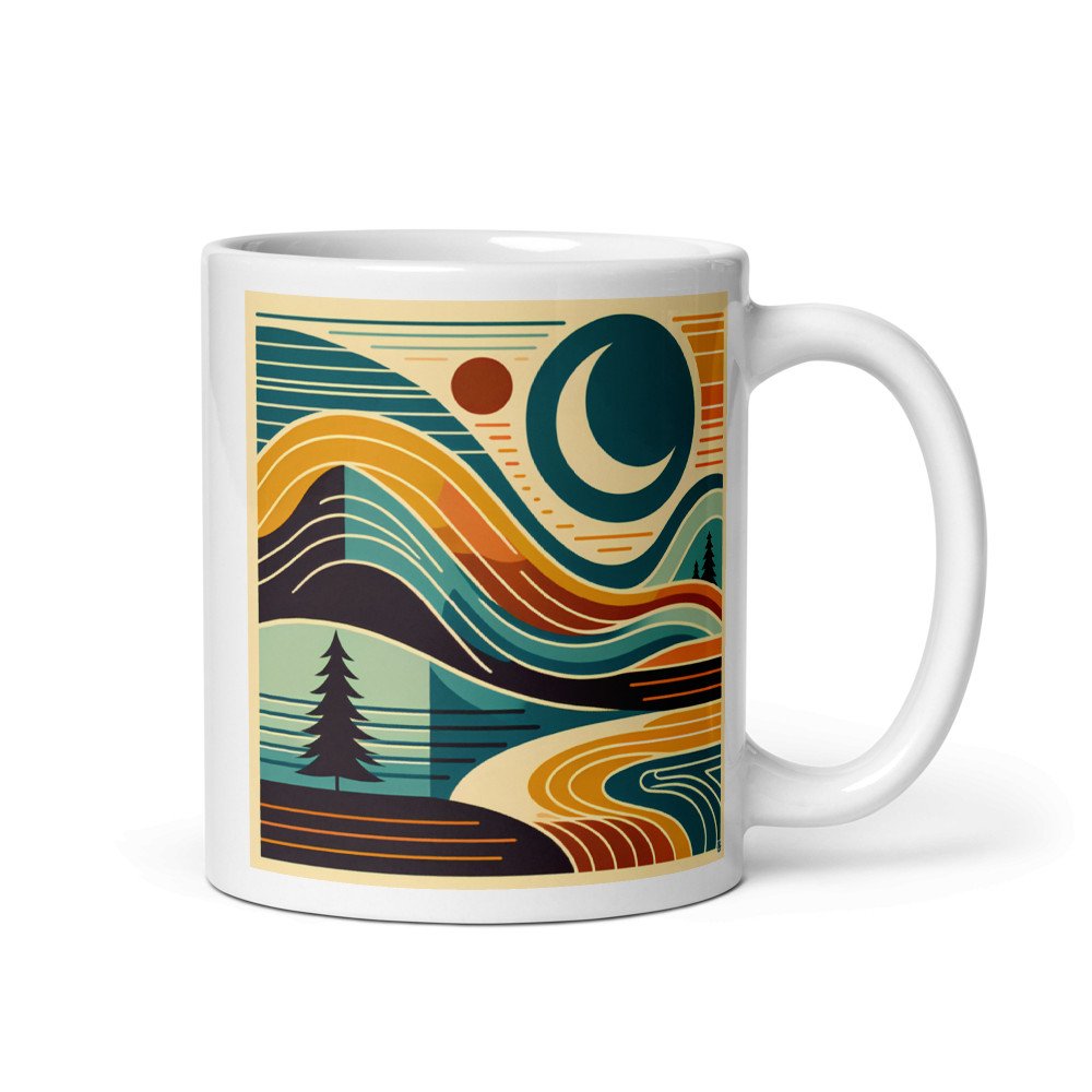 This glossy ceramic mug brings the topographic art into your daily routine. The wraparound print ensures the crescent moon and layered oranges are visible from every angle as you enjoy a hot drink.