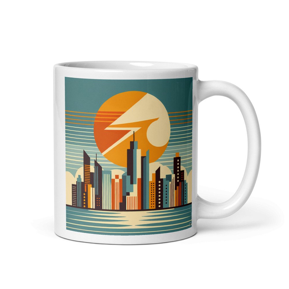 A stylised city skyline sits beneath a bold geometric sun, with layered stripes and clean vector shapes. The palette mixes teal, cream, and warm orange for a retro-modern feel. Crisp edges and simplified forms create graphic text art energy without using words.